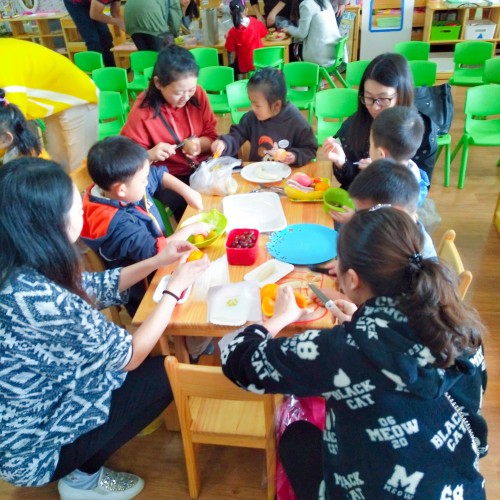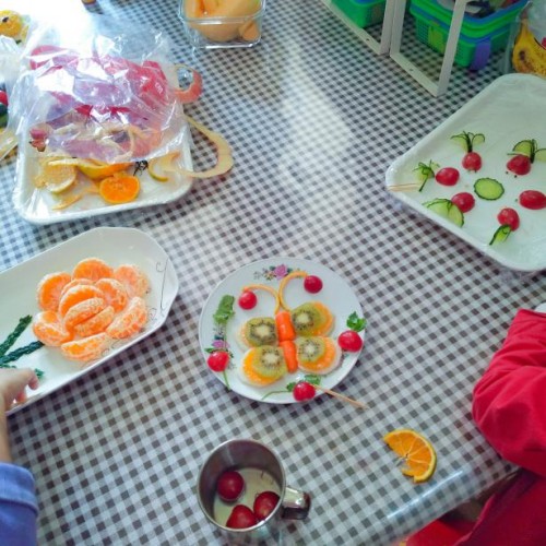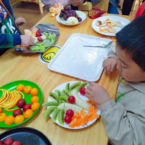 为了丰富幼儿园课程,增进家园联系,2017年11月2日南京市清水亭东路幼儿园开展了家长开放日活动,本次活动以亲子制作水果拼盘活动为主。首先,上午八点家长陆续来到幼儿园,先参观了孩子们的晨间锻炼活动,紧接着的是点心时间,九点二十就开始了孩子们和家长都期待的环节,亲子制作果盘,这是孩子们进入中班第一次参加亲子活动,活动现场热闹非凡,家长们和孩子们都尽情着发挥自己的创意,用灵巧的双手分工合作,充分提高了孩子的动手能力。有的将苹果,橘子等做成了可爱的螃蟹;有的将黄瓜、圣女果拼成了一条条灵活地小金鱼;有的将香蕉、猕猴桃、橘子做成海南特有的椰子树,极具风情~而小朋友们也忙的不亦乐乎,互相分享自己的创意与成品,时而品尝,时而帮忙,和爸爸妈妈一起玩闹,露出开心的微笑。在热闹,温馨的氛围中,一盘盘造型精美,五彩缤纷的水果拼盘就出来啦,有美丽的蝴蝶,可爱的螃蟹,雨伞,椰子树......