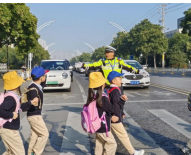 在远足的旅途中,交警叔叔有序地指挥着路上的交通。
