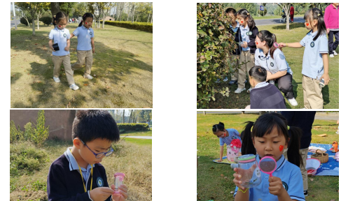 昆虫组的小朋友们在树丛边寻找着小昆虫等等。