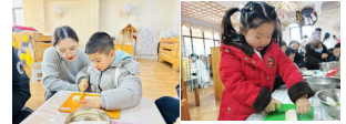 在老师的叮嘱下,孩子们认真将手中的萝卜切成长条状。