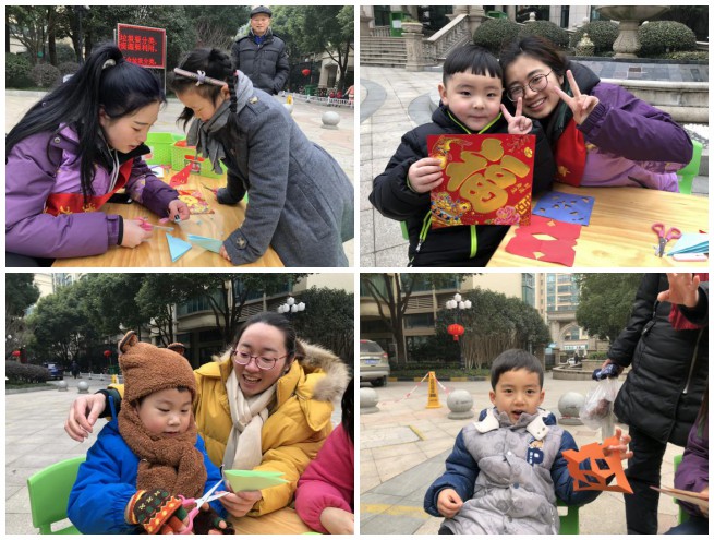 或许是临近春节,小区里来往的人并不多,加上今天的风有些大,鲜少有孩子出现。两位老师开始动手剪窗花,吸引孩子们的到来。仔仔小朋友是第一位光临“剪窗花”摊位的宝贝,看到桌上的窗花,仔仔笑着问道:“这是窗花吗?”接着便在志愿者老师的帮助下认真的剪起了窗花,剪了一个还不过瘾,又挑选了一张红色纸继续剪了起来,剪完后仔仔笑着说:“一个送给爸爸,一个送给妈妈。”志愿者老师给仔仔送上一份新年小礼物,一张“福字”,祝福仔仔“新年快乐”。一个小时过去了,人渐渐地多了起来,早起外出买菜的爷爷奶奶看到我们的活动,纷纷回家带自己的孙子孙女来参加活动,也有爸爸妈妈带着自己的孩子来参加活动。剪窗花是一项对小手精细动作发展要求较高的一项活动,大孩子能自己动手折好三角形,并沿边剪出一个个小三角形,小一点的孩子则需要志愿者老师的帮助,不论是哪一个孩子都愿意积极地参与到我们的“剪窗花”活动中来,打开窗花的那一刻,脸上洋溢着快乐的笑容。